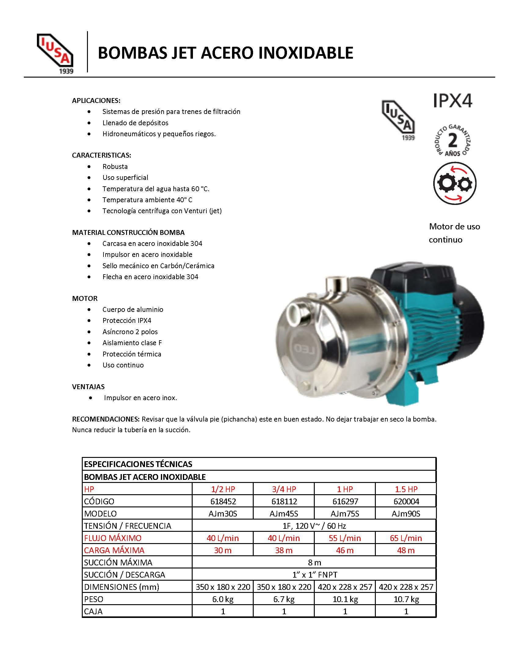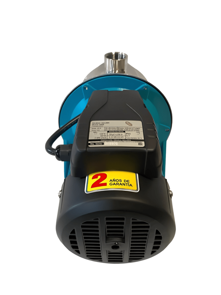Bomba eléctrica IUSA tipo jet con carcasa e impulsor en acero inoxidable, que permite manejar alta presión de agua gracias a su potente motor de 0.5 HP que brinda alto rendimiento con un flujo máximo de 40 L/min a una altura máxima de hasta 30 m, lo que la hace ideal para el manejo de agua potable, hidroneumáticos.