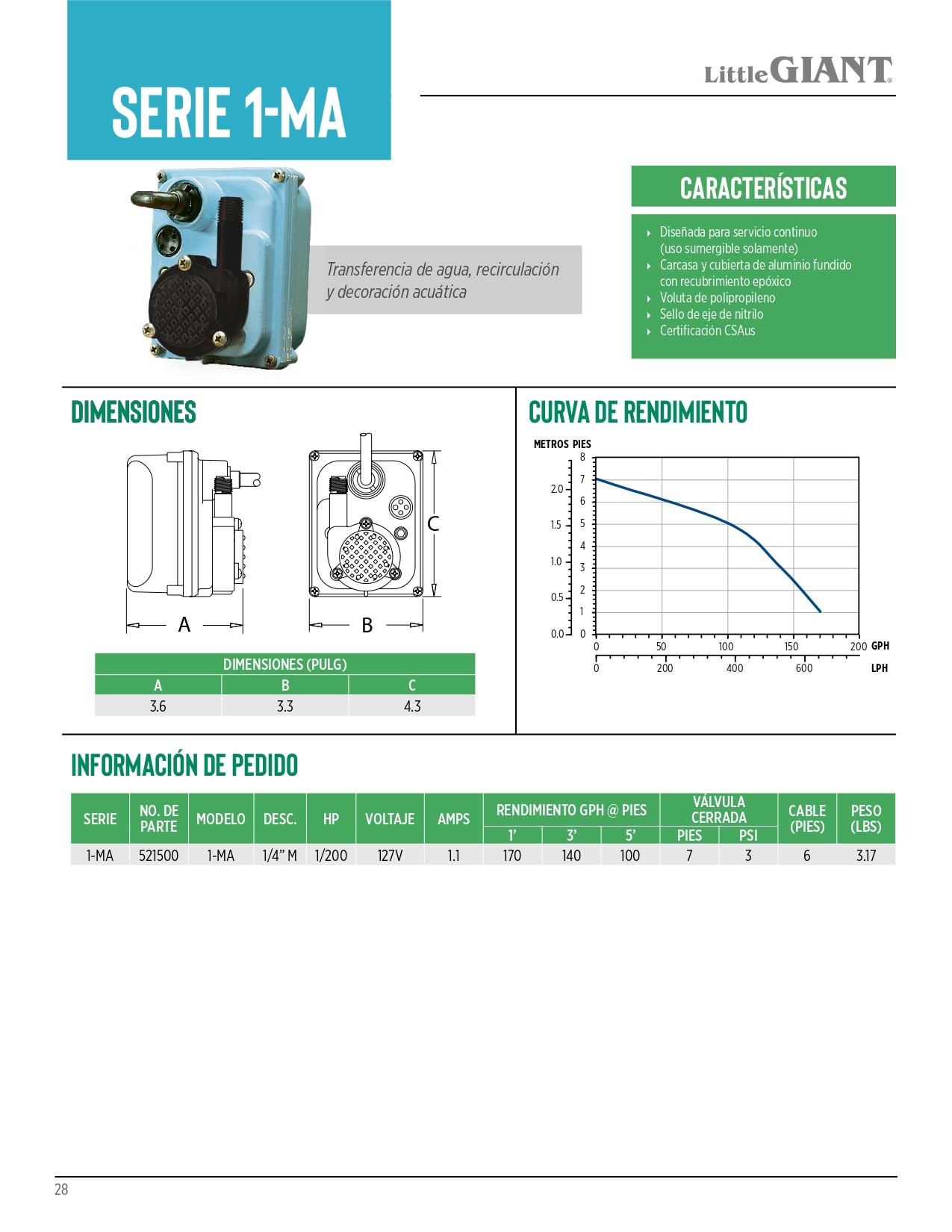 – Capacidad: 170 GPH @ 1 (643 LPH @ 0.3 m) – Cierre: 7 (2.1 m)