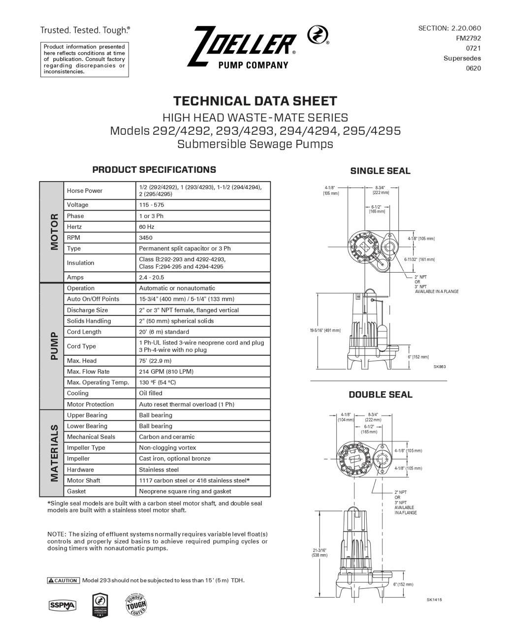 La serie de bombas E295 de 2 HP, son bombas de aguas residuales ( agua negra ) confiables y probadas. La serie E295 son bombas no automáticas que requieren un interruptor de flotador adicional o un tablero de control para su funcionamiento. Cualquiera de las opciones le permite configurar el punto de encendido y apagado de la bomba en el campo. Esto es ideal en una aplicación de cárcamo, planta de tratamiento, o la bomba sumergida en un tanque que almacene agua de lluvia, aguas residuales e incluso aguas negras. Sólidos blandos puede bombear sin problema, no piedras, no latas de refresco, no huesos de res.